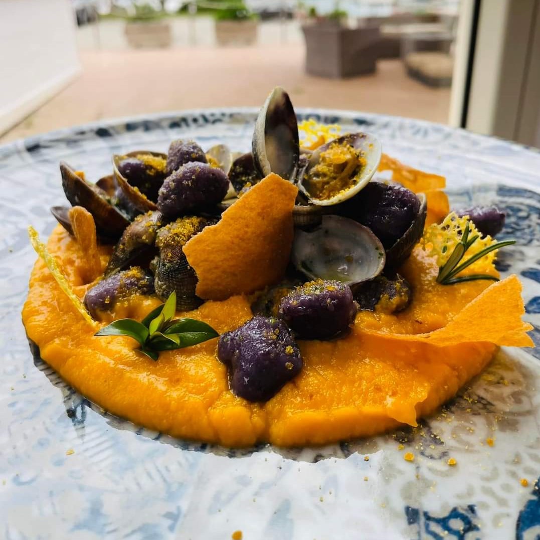 Gnocchi di patate viola saltati con burro e scalogno su una crema di zucca accompagnati da speck croccante